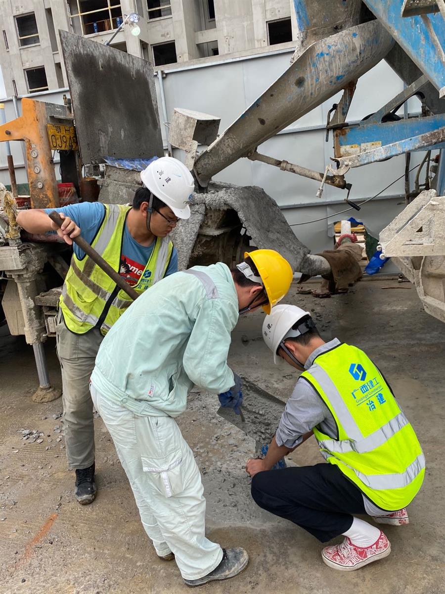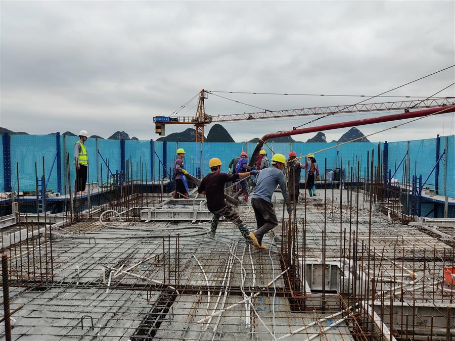 馬達(dá)聲、電鉆聲轟鳴,混凝土攪拌車、混凝土泵車、材料運(yùn)輸板車、土方綠皮車來往穿梭,綁扎鋼筋、混凝土塌落度試驗(yàn)、澆筑混凝土、升爬架前驗(yàn)收等工作有條不紊進(jìn)行,這是第四分公司融創(chuàng)江南林語項(xiàng)目的趕工現(xiàn)場。
