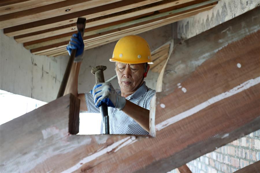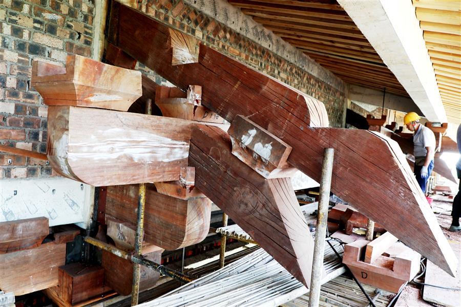連日來,在該項(xiàng)目湖心閣斗栱安裝現(xiàn)場,每天有20多名經(jīng)驗(yàn)豐富的木工師傅在認(rèn)真進(jìn)行斗栱安裝作業(yè)。為保證項(xiàng)目質(zhì)量,解決項(xiàng)目斗栱安裝難題,加快安裝速度,項(xiàng)目部結(jié)合實(shí)際,通過多次試驗(yàn)和優(yōu)化設(shè)計(jì),確保柱子能承受斗栱重量,采用正裝方式進(jìn)行安裝,保證了安裝速度和安裝質(zhì)量。面對(duì)項(xiàng)目選用的木制斗栱材料密度大、重量重、安裝作業(yè)工作面窄等困難,木工師傅結(jié)合自身多年的木工經(jīng)驗(yàn),克服現(xiàn)場施工遇到的困難,相互配合,目前已完成斗栱安裝工作量的三分之一。