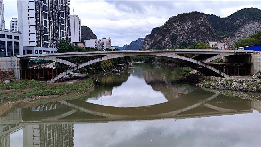 河池市龍江六橋(輝樂(lè)橋),全長(zhǎng)211.19米,其中主橋長(zhǎng)128.10米,凈跨徑90米、凈矢高13.50米、橋總寬26.5米。