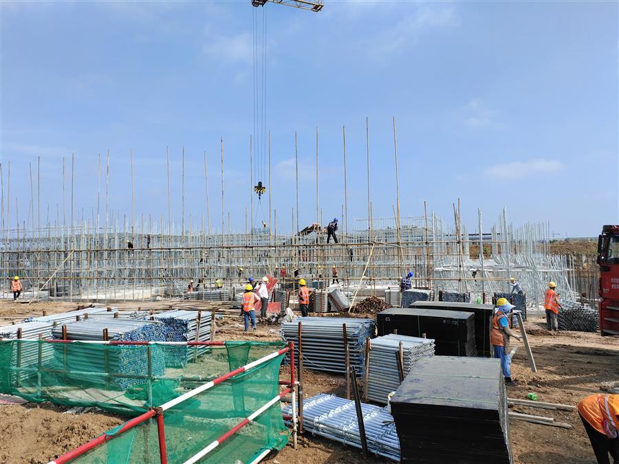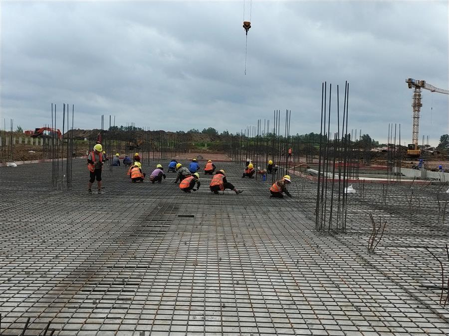 “日均投入施工技術(shù)人員500余人、各類機(jī)械設(shè)備45臺搶抓施工節(jié)點(diǎn)?!表?xiàng)目負(fù)責(zé)人禤旭云說,自6月開工以來,針對項(xiàng)目工期緊、任務(wù)重的情況,項(xiàng)目部按照“開工即攻堅(jiān)、起步即沖刺”的要求,全面推進(jìn)項(xiàng)目建設(shè)。目前,中試車間基礎(chǔ)回填、褥墊層鋪筑、墊層澆筑、剛性地面鋼筋綁扎完成;1#生產(chǎn)車間53~56軸獨(dú)基開挖基礎(chǔ)承臺鋼筋綁扎、模板安裝、砼澆筑完成,48~52軸基礎(chǔ)開挖、墊層澆筑完成;2#生產(chǎn)車間18~25軸基礎(chǔ)承臺鋼筋綁扎、模板安裝、砼澆筑完成;倉庫基礎(chǔ)梁全部完成。