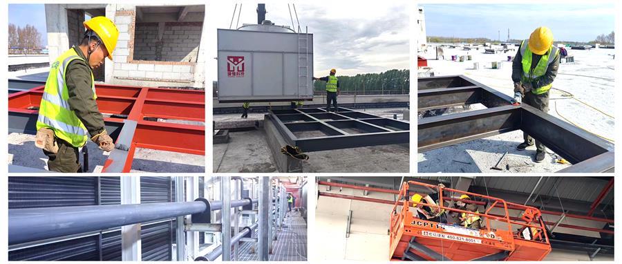 冷風機設備入場后,項目部立即有序開展焊接吊風機平臺工作,完成平臺焊接后,項目部合理安排進度計劃,實施進度管理。經(jīng)過項目部全體人員的連續(xù)奮戰(zhàn),項目4號庫12臺冷風機已順利安裝到位,管道安裝完成80%;1號庫完成4臺蒸發(fā)式冷凝器安裝工作,下一步進行管道安裝。