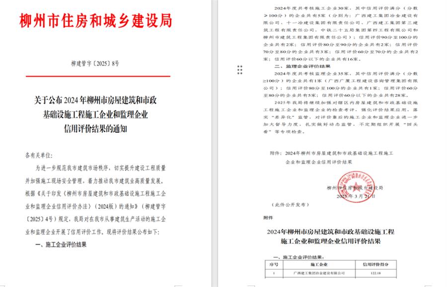 近日,柳州市住房和城鄉(xiāng)建設(shè)局發(fā)布《關(guān)于公布2024年柳州市房屋建筑和市政基礎(chǔ)設(shè)施工程施工企業(yè)和監(jiān)理企業(yè)信用評價結(jié)果的通知》(柳建管字〔2025〕8號),冶建公司以122.18分的優(yōu)異成績,位列柳州市施工企業(yè)信用評價榜首,彰顯了公司在工程質(zhì)量、安全管理及市場信譽(yù)等方面的卓越實力。