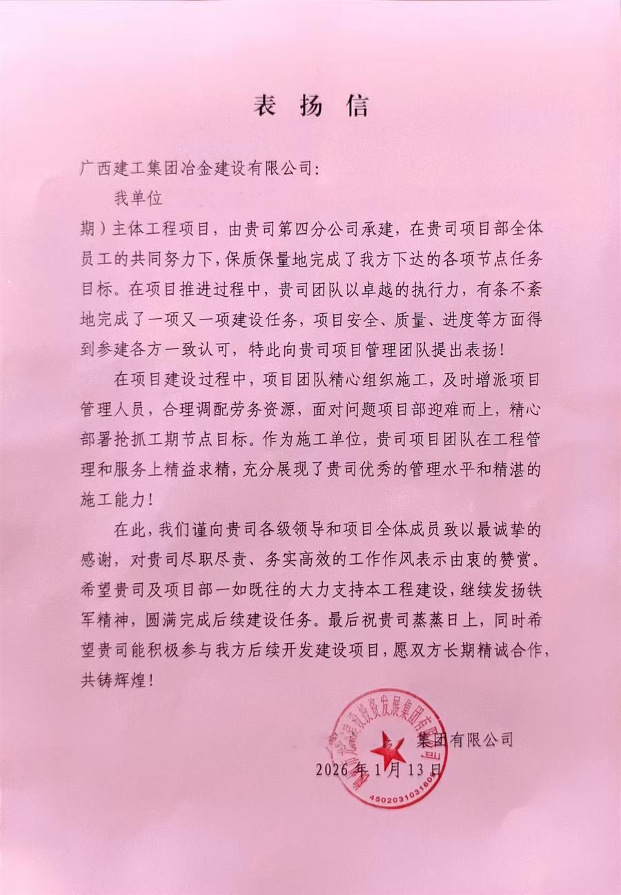 近日,冶建公司第四分公司憑借出色履約表現(xiàn),收到業(yè)主單位發(fā)來表揚信。
