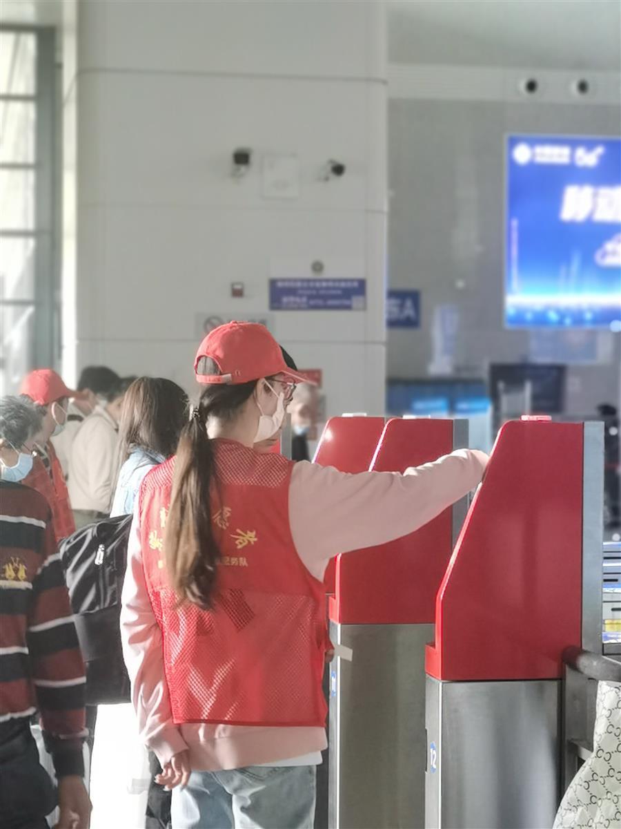 冶建志愿者們在火車站協(xié)助車站工作人員做好疫情防控工作,在進站口給乘客測體溫,核實健康碼、行程碼、核酸證明,引導乘客刷身份證進站、為進出站的乘客指路。