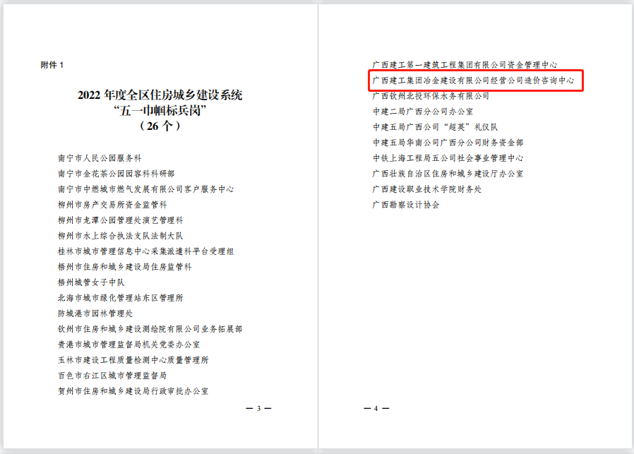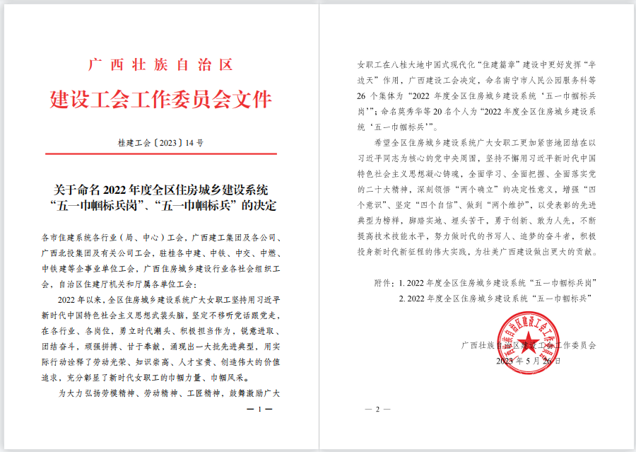近日,廣西建設(shè)工會(huì)工作委員會(huì)下發(fā)了《關(guān)于命名2022年度全區(qū)住房城鄉(xiāng)建設(shè)系統(tǒng)“五一巾幗標(biāo)兵崗”“五一巾幗標(biāo)兵”的決定》,冶建經(jīng)營(yíng)公司造價(jià)咨詢(xún)中心榮獲“五一巾幗標(biāo)兵崗”稱(chēng)號(hào)。